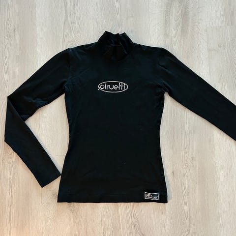 Musta Mäser poolopaita. Edessä kauluksessa vetoketju. 100% puuvillaa. Kokomerkintä 36. On aika napakka, joten menee mielestäni paremmin jos on kokoa 34.