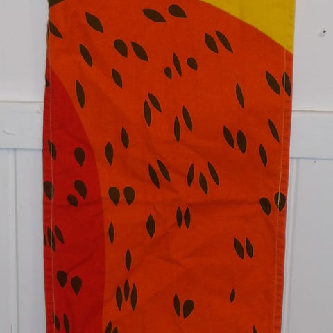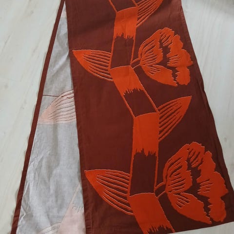 Marimekon Mansikkavuoret kankaasta itse ommeltu kaitaliina. 210 cm pitkä ja 30 cm leveä.