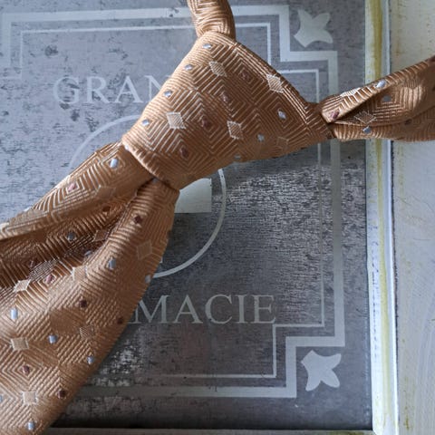 Myydään Marja Kurjen silkkisolmio. Kuviollinen solmio, jossa beigen pohjavärin päällä sinisiä ja tummia koristekuvioita.