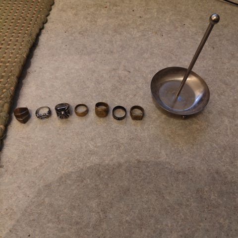 Kivisormuksen koko 20 ja toisen sormuksen koko 19. Kivisormuksessa merkintä 925. Sormuksissa ei muita leimoja.