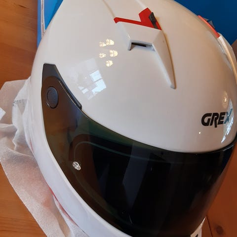 Grex kokokasvokypärä moottoripyörä-/mopokäyttöön. Varustettu kirkkaalla visiirillä ja pehmustetulla sisäosalla. Leukahihnassa on pikasolki kiinnitystä varten. Käytetty mutta hyvässä käyttökunnossa.