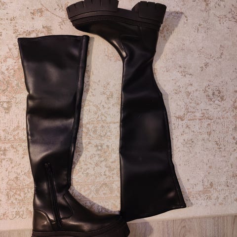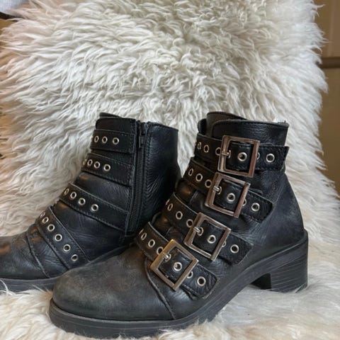 Mustat nahkanilkkurit paksuhkolla pohjalla. Venykkeellinen varsi. Varressa ja jalkapöydän päällä hieman nahassa taittumaa mikä kenkiin väistämättä tulee. Uutena ostettu, ollut vain muutamasti käytössä. Jäi itselle harmillisesti pieneksi kun jalka raskauden myötä kasvoi.