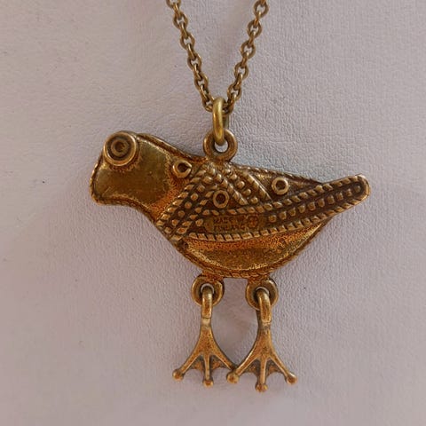 Kalevala Korun Hattulan lintu -aiheinen pronssiriipus ketjulla.