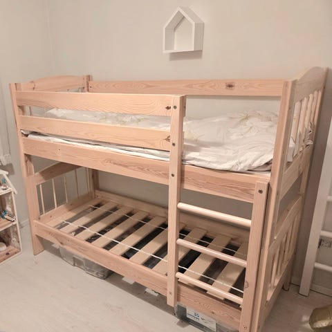 Vankka lasten kerrossänky seuraavaan kotiin! Pieniä käytönjälkiä ja kulumaa on, mutta tosi siisti silti! Sängyt saa myös erilleen omiksi sängyikseen. Aluslaatikko tilava. Mukaan saa halutessaan patjat ja patjasuojat sekä pilkullisen verhon/verhokiskon alasänkyyn. Ulkomitat: korkeus 145cm, pituus 172cm ja syvyys 75cm. mmm.