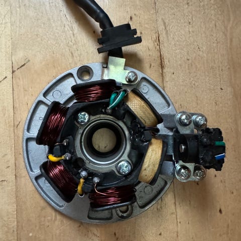 SR500 magneetto ja staattori. Aikanaan tarkistettu pyörässä kiinni, vaatii käämityksen.