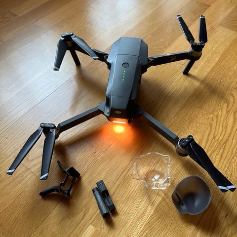 DJI Mavic Pro -kameradrone taittuvilla potkureilla. Mukana kaukosäädin ja useita akkuja. Drone soveltuu ilmakuvaamiseen ja -videointiin. Kompakti koko helpottaa kuljettamista ja säilytystä. Tarkemmat tekniset tiedot, kuten kameran resoluutio, lentoaika ja yhteensopivat lisävarusteet, kannattaa tarkistaa valmistajan ohjeista tai tuotetiedoista.