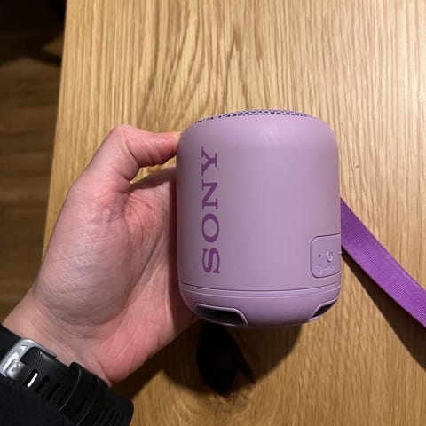 Sony SRS-XB01 langaton kaiutin. Kompakti kannettava kaiutin Bluetooth-yhteydellä. Laitteessa on äänenvoimakkuuden säätöpainikkeet, toistopainike sekä rannelenkki helpottamaan kantamista. Soveltuu musiikin kuunteluun hoitamiseen esimerkiksi kotona tai matkalla.