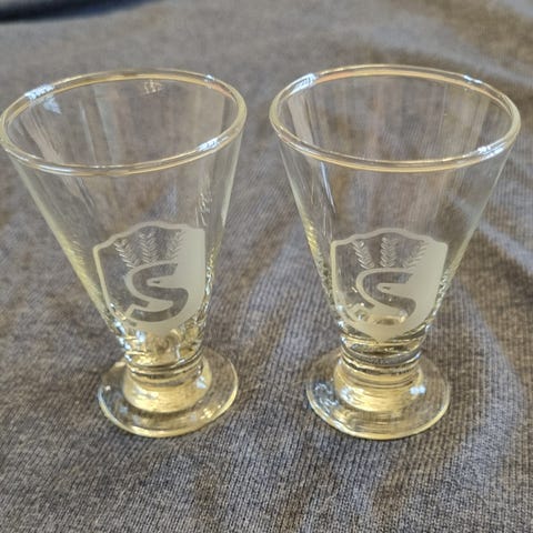 Alkuperäinen. Äärimmäisen harvinainen. Etsattu Suojeluskunnan merkki. 8 cm korkea snapsilasi. Virheetön.