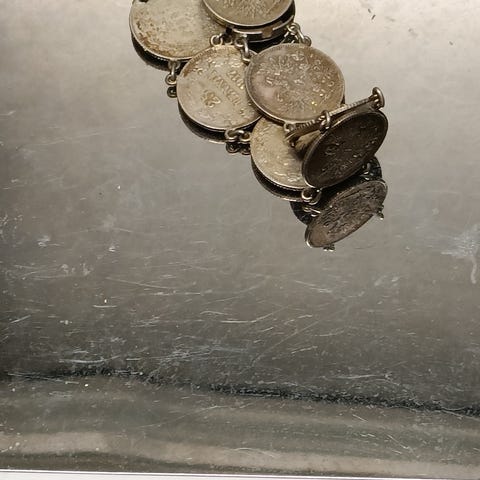 Painava vintage-rannekoru, jossa on puolikuun muotoiset lenkit. Rannekoru suljetaan laatikkolukolla ja tuplaturvaklipsulla.Koko: 19,5 cm käyttöpituus - 2,2 cm leveysPaino: 42,6 grammaaMerkitty 835:lläRiippuen sijainnistasi, lähetämme DHL Expressillä tai UPS:llä. Yhdistetyt lähetykset ovat mahdollisia, lähetä meille viesti, jos aiot tehdä useamman ostoksen tai olet jo tehnyt sen. Jos et ole vielä maksanut toisesta ja seuraavista kohteista, voimme poistaa näiden kohteiden lähetyskulut. Jos maksat kaikista kohteista lähetyskuluineen, voimme palauttaa ylimääräisen summan IBAN-tilille tai Paypal-tilille. Myös tässä tapauksessa, ole hyvä ja lähetä viesti.