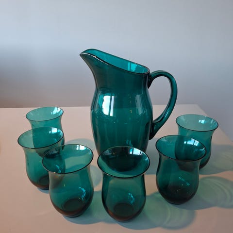 Kaikki lasit ehjiä ja pidikkeet hyväkuntoisia. Yksi ylimääräinen vihreä pidike mukana.