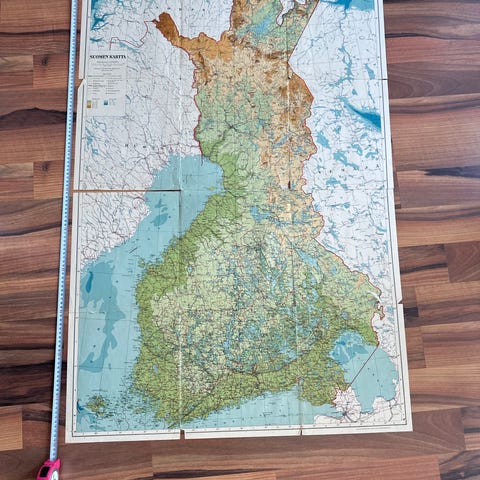 Iso Suomen kartta seinälle, noin kaksi metriä korkea. hyvässä kunnossakin on, pieni kolo ylä kulmassa, varmaan korjattavissa. Vuosi mallia 1962.