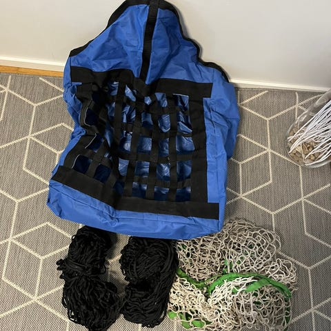 Molemmista heinäpusseista toisen ripustusrenkaan kohdalta kangas repeytynyt (ks. viimeinen kuva).