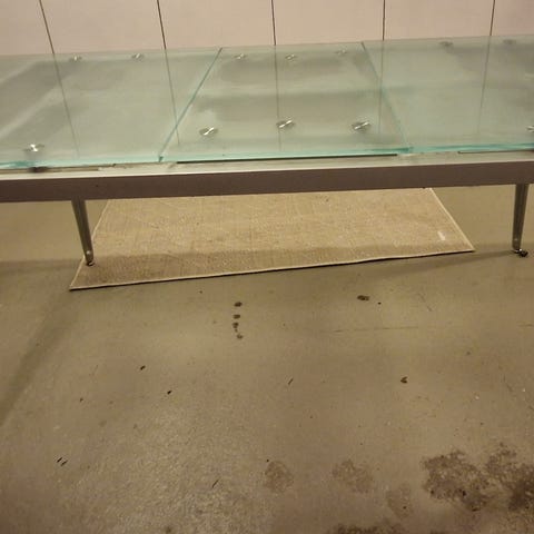 Rautajalkainen soikea pöytäkansi lasilla. Pöytätaso tehty itse .