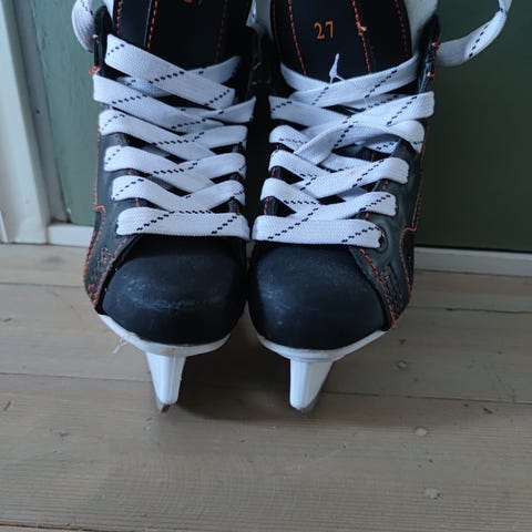 Lasten jääkiekkoluistimet, koko 27. Väri mustavalkoinen. Luistimissa on nauhakiinnitys ja mahdollisuus tukevaan nilkan tukemiseen, mistä apua etenkin luistelun harjoittelussa. Oli viime talvena 3-4 -vuotiaalla.
