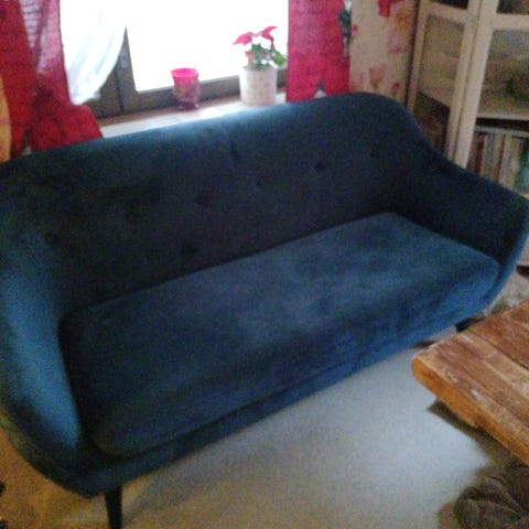 Myydään vanha mutta mukava kangasverhoiltu sohva. Selkänojan tyynyt pysyy hyvin paikoillaan tarrakiinnityksellä. Kangas on paikoin kulahtanut. Sohvaa on pesty ajoittain tekstiilipesurilla.