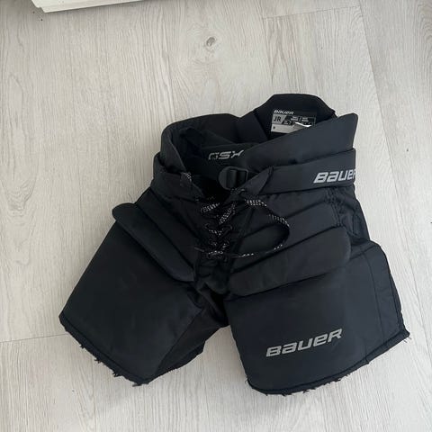 CCM jääkiekko maalivahdin housut juniorikoossa YT L-XL. Väri musta punaisilla yksityiskohdilla. Housuissa on pehmustetut suojat lantiolle, reisille ja alaselälle sekä kiristettävä vyötärönyöri.