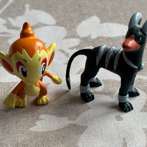 Pokémon Growlithe ja Arcanine figuurit. Pienet muoviset hahmot. Sopivat esimerkiksi kokoelmaan, leikkeihin tai koristeeksi. Korkeus muutamia senttimetrejä. Myydään yhdessä. Arcanine-hahmon silmät koristeltu geelikynällä.
