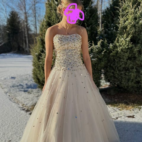 Myydään tarpeettomana vaalea, hää- tai iltapuvuksi mainioksi soveltuva upea mekko. Palvelee hienosti myös vanhojen tansseissa, joissa mekko käytössä ollutkin. Etumuksessa ja helmassa helmiäiskirjailu. Sisäosassa tylli. Ostettu uutena hintaan 619e ja ollut oston jälkeen käytössä kolmesti. Kunto hyvä. Koko S. Mekko ollut pitkään pakattuna ja siksi kuvissa näkyy pientä ryppyä, mikä oletettavasti oikenee ajan kanssa tai varovaisesti silitettäessä.