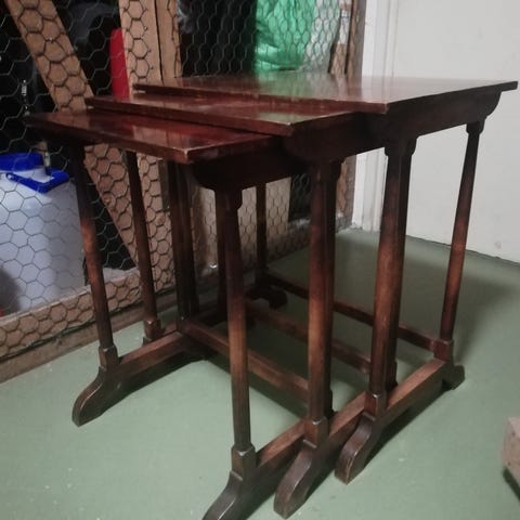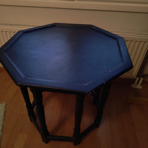 Omintakeinen tolppajalkainen pöytä historian hämäristä. Kannen pinta on huopakangasta ja sama pätee kannen alta löytyviin jatkopaloihin. Pöytä on tukeva ja jatkopalat ovat helppokäyttöisiä; kannen keskiosan huopakangas on paikka paikoin tuhruinen ja kulunut, jatkopalat sen sijaan ovat lähes uudenväärtit. Pöydän historia ja taustat ovat tuntemattomia. Kannen mitat ilman jatkopaloja 85 x 75 cm, yhdellä jatkopalalla 120 x 75 cm, kahdella jatkopalalla 155 x 75 cm. Korkeus 78 cm, vapaa polvitila kannen alla 62 cm, paino n. 18 kg. Vankkatekoinen, vaikka askartelupöydäksi! Kotiinkuljetus järjestyy samaan hintaan Tampereella ja naapurikunnissa, kysäise!
