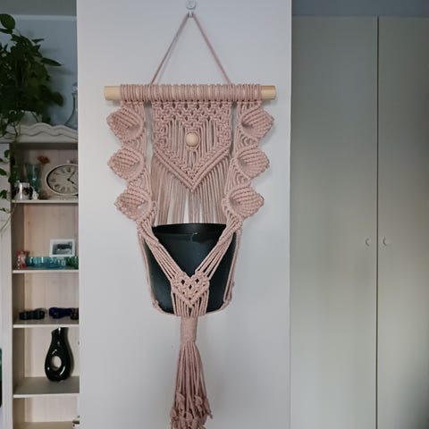 Makramee seinäamppeli, väri sinappi. Työn leveys 26cm ja korkeus 73cm ( mitattu ripustuskoukusta alas ) 25e