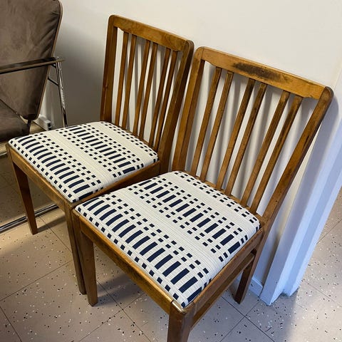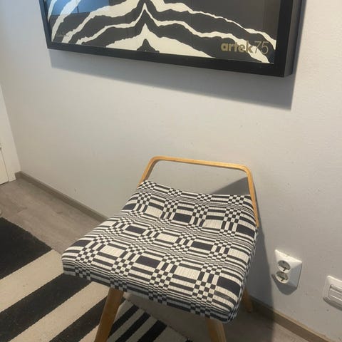 Jakkarat. Valkoiseksi maalatut. Verhoilukankaana Johanna Gullichsen mustavalkoinen tithonus. Korkeus 46 cm. Istuimen Ø n. 35 cm. Jakkarat ovat tukevat, mutta Vintagekuntoiset eli jaloista löytyy kulumaa ja kolhua. Nouto Vaasasta tai lähetys esimerkiksi toridiilinä.
