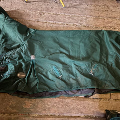 Käytännössä uusi kaulakappaleellinen sade-ja ötökkäloimi. Selkäosa sadeloimikangasta, alaosa hengittävää verkkomateriaalia. Meille oli aavistuksen pieni, niin ollut vain kerran päällä. Koko 135 cm.
