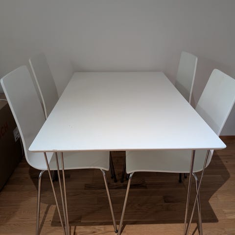 Ruokailuryhmä. Pöytä 120 cm x 80 cm + 2 x 30 cm jatkopalat. Tuolit 4 kpl kaipaavat pientä korjailua. Menevät toki tuossakin kunnossa. Tarvittaessa kuljetus Mikkelin taajama-alueella mahdollinen pientä korvausta vastaan.