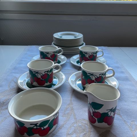 Hyväkuntoinen, ehkä ja hyvin vähän käytetty kokonainen 12 kupin Arabian Kristiina astiasto johon sisältyy kermakannu ja sokerikippo. Ei puuttuvia osia.