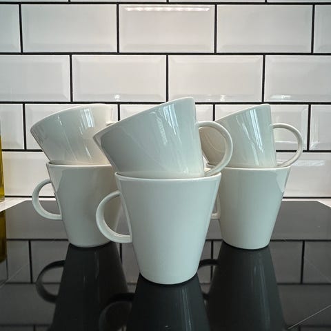 Kuvassa viisi eriväristä mukia, joissa kartiomainen muoto ja korva. Sopivat esimerkiksi kahvi- tai teemukeiksi arkeen ja kattaukseen. Monivärinen kokonaisuus tuo vaihtelevuutta astiastoon ja mukit ovat pinottavissa tavalliseen astiakaappiin.