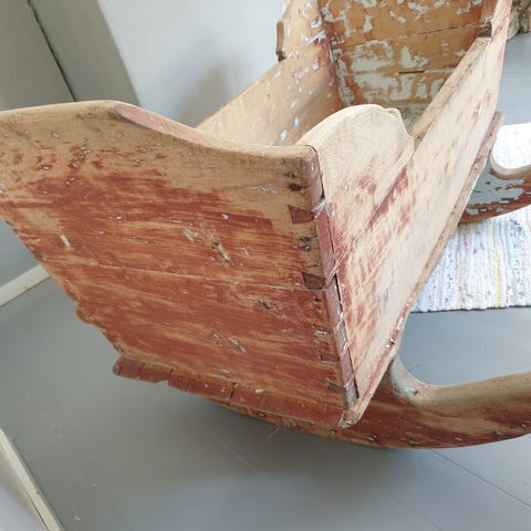 Kauniisti patinoituneessa alkuperäiskunnossa oleva kehto lähes 200 vuoden takaa, n. 1830- tai 1840-luvulta. Historia tiedossa. Ehjä, puhdas ja tukeva, toki ajan ja käytön kuluttama. Alkuperäiset värit. Pituus 101 cm, leveys jalkoineen 77 cm, pelkän kaukalon leveys 45 cm, päätyjen korkeus 46 cm, laitojen korkeus 37 cm. Kehto painaa kymmenisen kiloa. Kaukalon sisämitat (leveys x pituus) 36 x 96 cm. Aitoa, elämää nähnyttä talonpoikaisantiikkia! Kotiinkuljetus järjestyy samaan hintaan Tampereella ja naapurikunnissa, kauemmaksikin polttoainekuluja vastaan. Kysy!