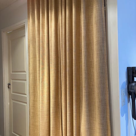 Eurokankaasta ompelupalvelulla noin vuosi sitten ostetut verhot. Väri puuteri/haalea vaaleanpunainen. Levee 150cm ja korkee 240cm, 60e pari