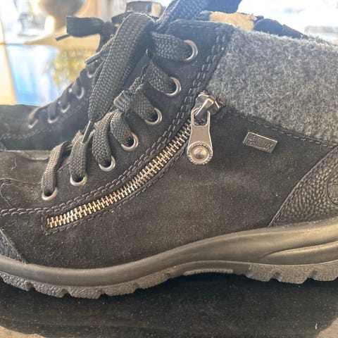 Rieker talvikengät, koko 38. Nauhalliset varrelliset kengät, joissa vetoketju sivussa.Liukuesteet pohjassa.