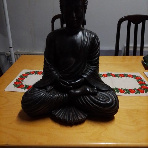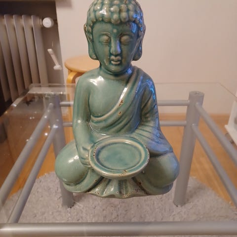 Pieni ruskea Buddha-patsas. Materiaali vaikuttaa olevan kovaa muovia tai hartsia. Patsas esittää seisovaa, hymyilevää Buddhaa rukousnauhan kanssa. Sopii esimerkiksi sisustuselementiksi hyllylle, pöydälle tai alttarille. Korkeus ja tarkat mitat eivät ole tiedossa.Nouto tai postitus.Käteinen tai mobilepay.