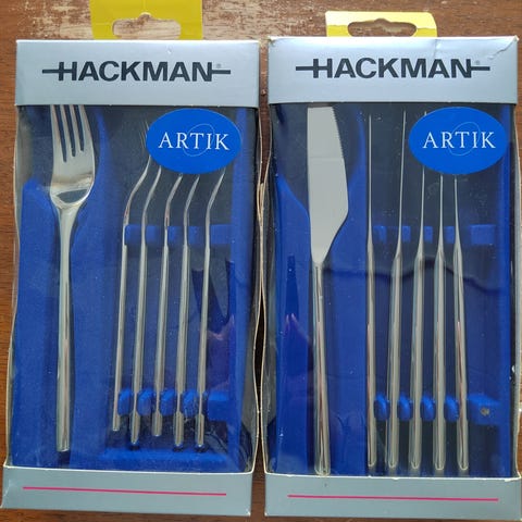 Pienet leikkelehaarukat / jälkiruokahaarukat / kakkuhaarukat Hackmanilta. Kunto hyvä käytetty, yhdessä haarukassa varressa pieni n 1 mm kolo.