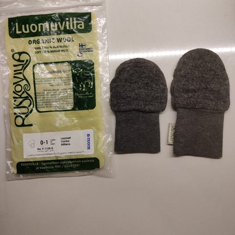 Koko 0-1v, ostettu uutena syksyllä 2025 ja käytetty 4-6kk ikäisellä vauvalla. Tosi siistit, aavistus jotain pientä tummentumaa paikoitellen. 100% merinovillaa