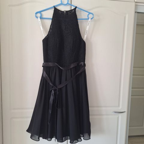 Lisabella juhla- tai cocktailmekko naisille. Koko 38. Mekko on musta. Puolipitkät hihat, joissa koristeelliset kerros- ja kukkamaiset yksityiskohdat hihansuiden kohdalla, taskut, takana vetoketju. Sopii juhla- ja tilaisuuskäyttöön.