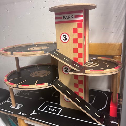 Parkkitalo, noin 80cm korkea hissiin asti. Huom hissi pattereilla, mutta se epäkunnossa. Mutta voi leikkiä hyvin ilman sitäkin.