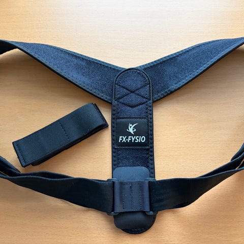Toinen hihna kiinnitetään vyötärölle ja toinen hartioiden yli ja siitä selän taakse. Auttaa pitämään hyvän ryhdin.