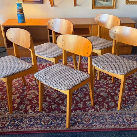 Juuri pintakäsittelyt ja verhoillut mid century modern tyyppiset tummat puutuolit. Tukevat ja kauniit moderniin sisustukseen.