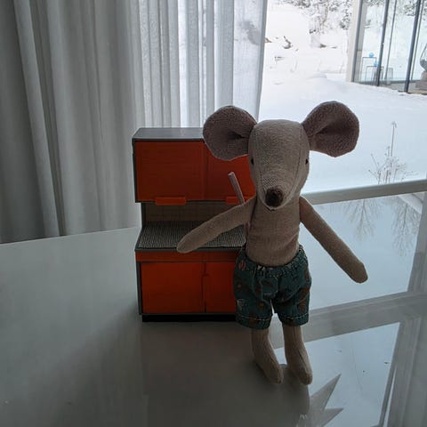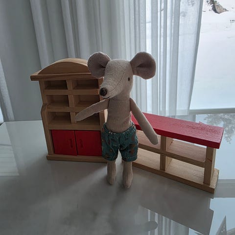 Pieni nojatuoli esimerkiksi Maileg-hiirten kotiin (kuvassa isovelihiiri 13cm). Kokonsa puolesta sopii parhaiten vauvahiirille.