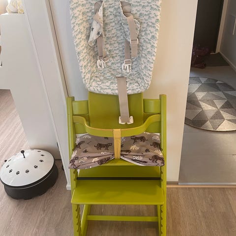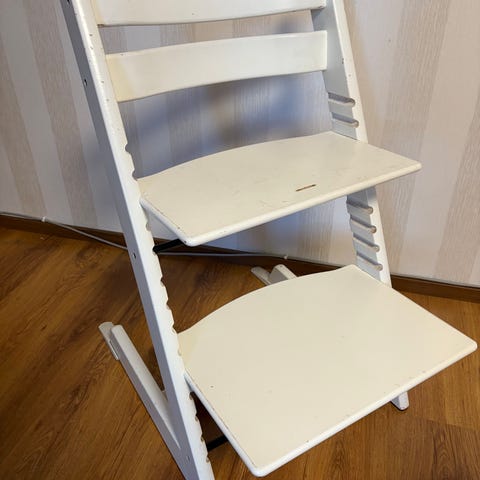 Stokke syöttötuoli. Materiaalina puu ja väri musta. Tuolissa on säädettävä istuin- ja jalkataso, jotka voidaan asettaa eri korkeuksille lapsen koon mukaan. Soveltuu lapselle, joka tarvitsee korkeamman istuinkorkeuden ruokapöydän ääressä. Tuolissa on nahkainen turvavyö etuosassa lisätukea varten. Osa ruuvien jenkoista on mennyt huonoksi joka hankaloittaa istuinkorkeuden säätöä.