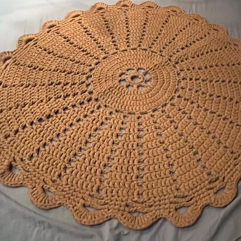Kuvan uusi, vaaleanruskeasta ontelokuteesta virkattu matto. Halkaisija 155cm. Tehty kissakodissa.