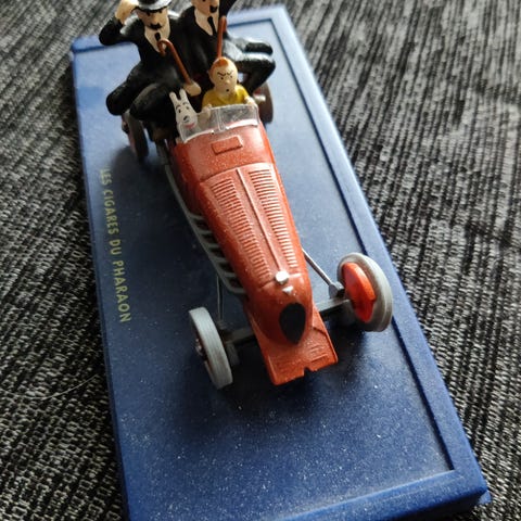 Tintin Le Cabriolet de Madame pienoismalli. Vaaleanpunainen avoauto, jossa Tintin-sarjakuvasta tuttuja hahmoja auton sisällä. Auto on läpinäkyvässä vitriinilaatikossa, jonka taustalla on sarjakuvamainen maisemakuva. Sopii keräilyesineeksi Tintin-aiheisista tuotteista kiinnostuneille tai koristeeksi hyllylle.