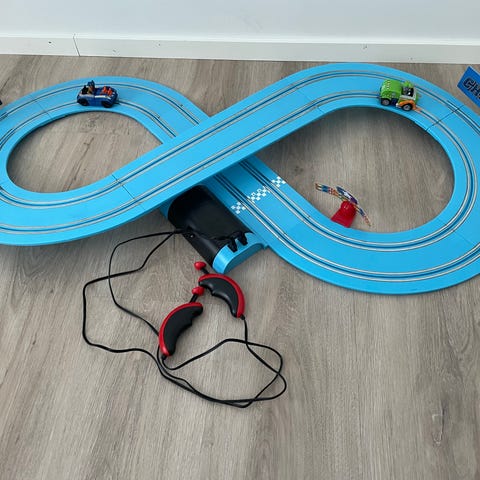 Carrera Ryhmä Hau autorata. Paljon ajettu mutta toimiva. Tullut meille käytettynä joten voi olla että joitain osia alkuperäisestä puuttuu. Autojen allaolevia "kuljettimia" saattaa joutua vääntelemään ennen ajoa, jotta toimii.