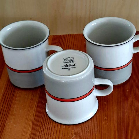 Arabia Aslak kahvikupit 6 kpl, kupin korkeus 6,5 cm, halkaisija 7 cm, asetti 12cm ja pullalautanen 17 cm. Suunnittelija Inkeri Leivo, tuotannossa 1990-1995.