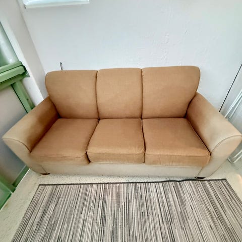 Sohva on ostettu kesällä -24 ja sitä on käytetty vain muutamia viikkoja vierassohvana, mutta ikävä kyllä lapsivieraiden jäljiltä kankaassa on tahroja, mm. värikynistä mutta myös ruoasta (?). Yleisilme kuitenkin ihan hyvä ja ainakin osa tahroista lähtee luultavasti pyyhkimällä.