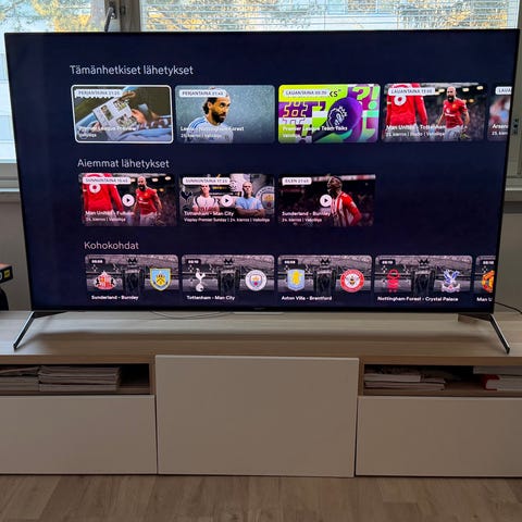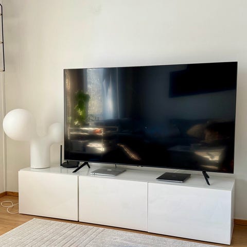 Tv-tasossa on 2 avohyllyä, 2 vetolaatikkoa ja keskellä kaappi, johon saa laitettua toisenkin hyllyn, hylly on tallessa. Kuvissa näkyvä tv on 65 tuumainen.