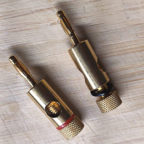 kaksi paria kullattuja banaaniliittimiä. reiän halkaisija 4 mm.