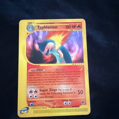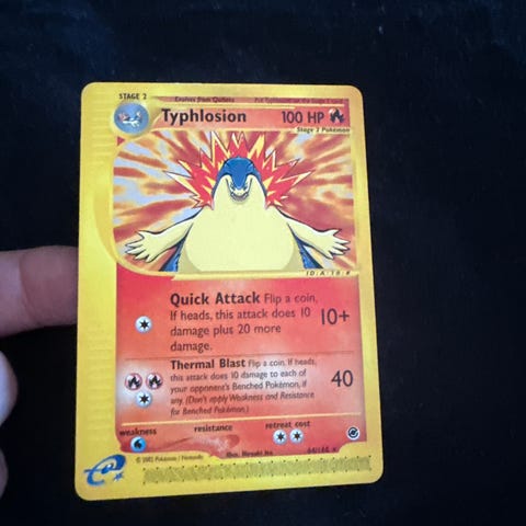 Pokémon Typhlosion keräilykortti. Kortissa on Typhlosion-hahmo sekä hyökkäykset Flickering Flames ja Rage. Kortin etupuolella näkyy 110 HP -arvo ja tulityyppinen tausta. Takapuolella on perinteinen sininen Pokémon-kortin tausta poképallokuvalla. Soveltuu Pokémon-korttikokoelmaan tai pelaamiseen.