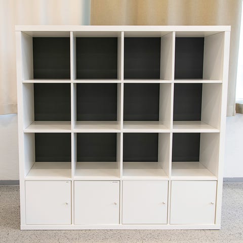 Hyllyssä on kuvan mukaisesti 3 riviä lokeroja ja alimpana 4 kaappia. Hylly on Ikean mallistoa.